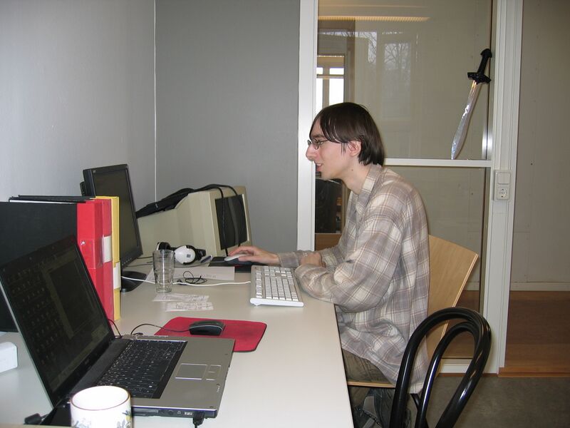 An image provided by Jens "jeb" Bergensten on the Project Oxeye Wiki Discord. Original caption: Another picture from the new office. Jonas Johnsson ("STALKER") was a member of Oxeye for a short while and helped with graphics programming (shaders), and financial book-keeping.